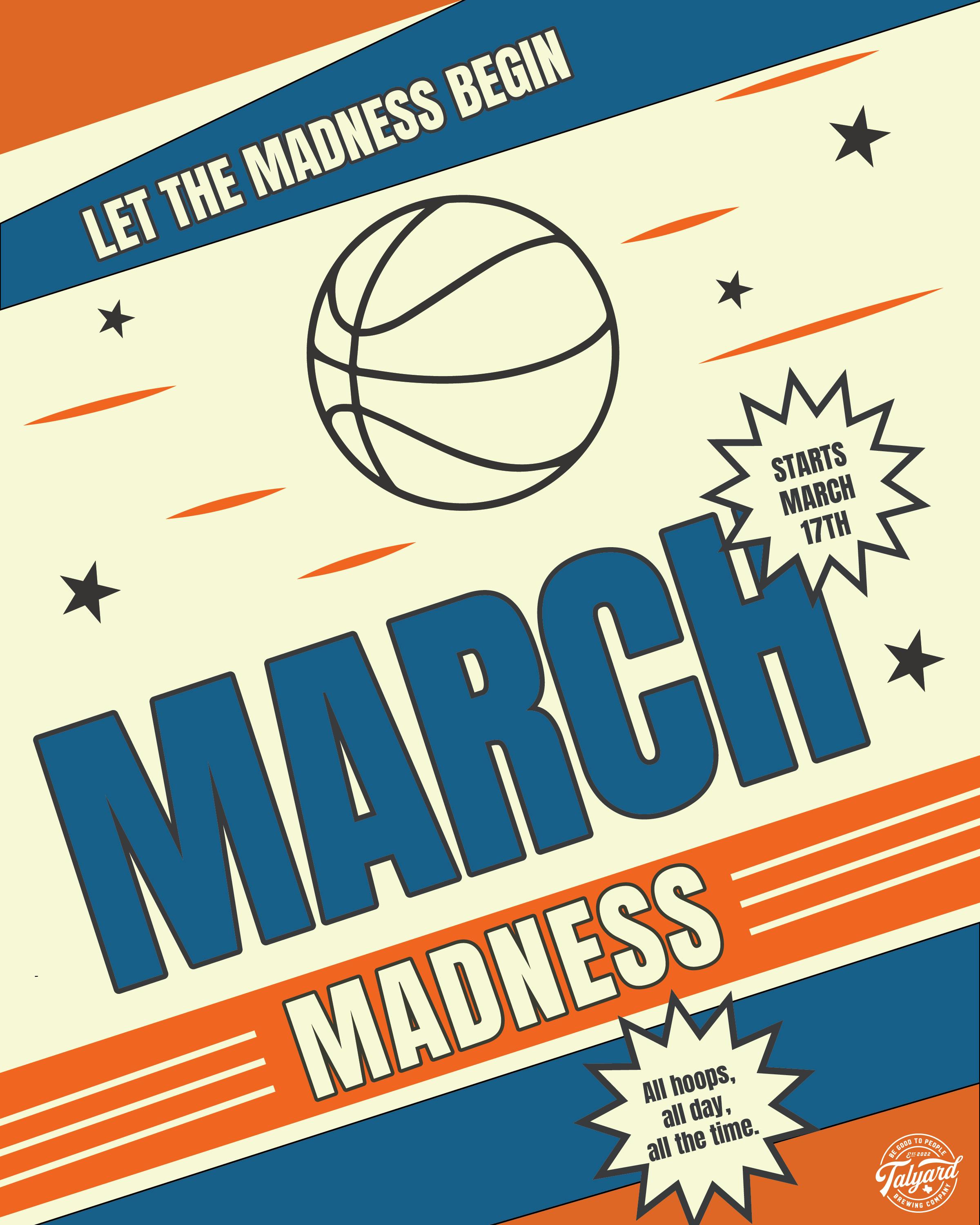 Let the madness begin.......... March Madness Begins - March 17 All hoops, all day. Enjoy March Madness at Talyard — and mark March 19 as your official skip day. If you need a doctor’s note, we’ve got you. |